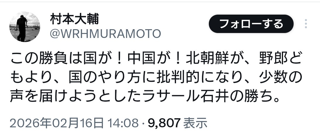 | … | 9無題Name名無し 26/02/15(日)23:28:59 IP:14.193.*(j-cnet.jp)No.4392431そうだねx5>そんなラサール石井に社民党の党首が務まるのか? |