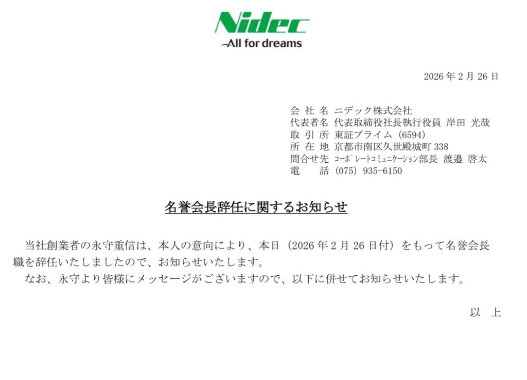 創業者の永守氏は去年12月に代表取締役、先月に名誉会長を辞任しています。