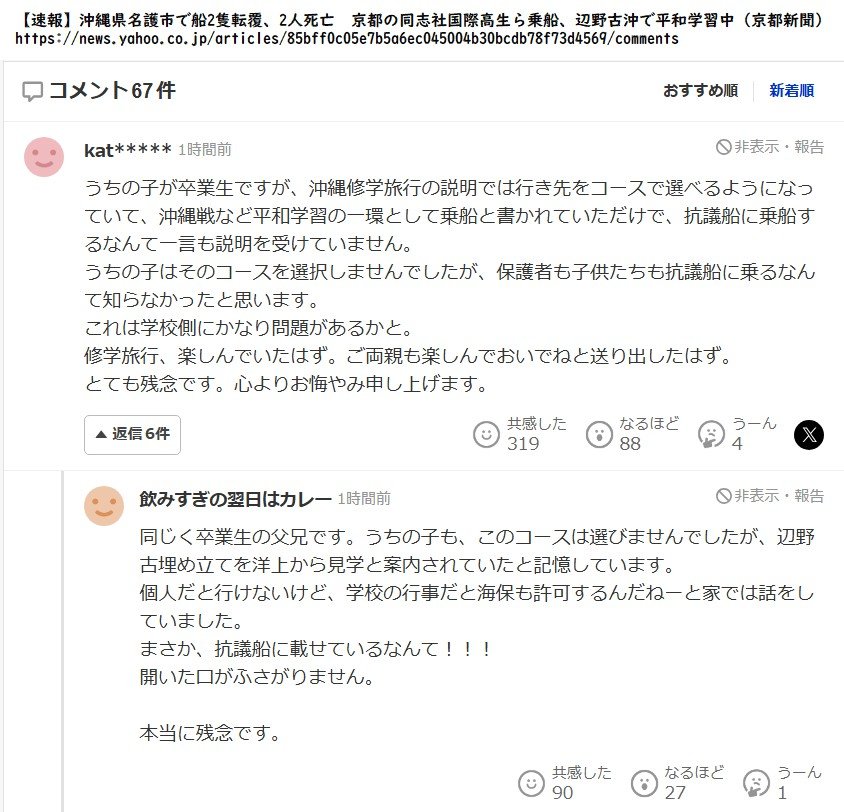 関係者によると、2隻の乗船者は同志社国際高校(京都府)の生徒がほとんどだという。学校によると、高校2年生で平和学習の研修旅行中だったという。