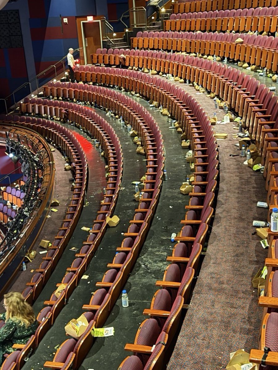 フィフィは、「オスカー授賞式、参加者が去った後の会場…これが日頃、道徳、敬意、環境問題、そして、その他諸々を声高に叫ぶ人たち」と投稿し、1枚の写真を添付。写真は空席となった会場の床の至る所に、ペットボトルや食品が入っていたと見られる紙ボックスやビニール袋が散乱している。