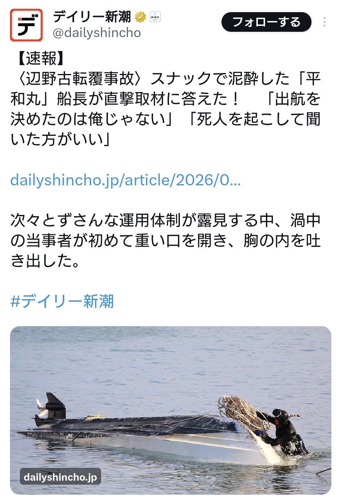 | … | 1無題Name名無し 26/03/24(火)20:09:34 IP:222.159.*(bbiq.jp)No.4396129+事故で死亡したのは、研修旅行の平和学習で乗船していた同高2年の女子生徒(17)と、転覆した船の船長、金井創さん(71)。16日午前、生徒18人や金井さんら計21人が分乗した「平和丸」(長さ7・63メートル)と「不屈」(同6・27メートル)が相次いで転覆し、全員が海に投げ出された。ほかに生徒2人が負傷したという。 |