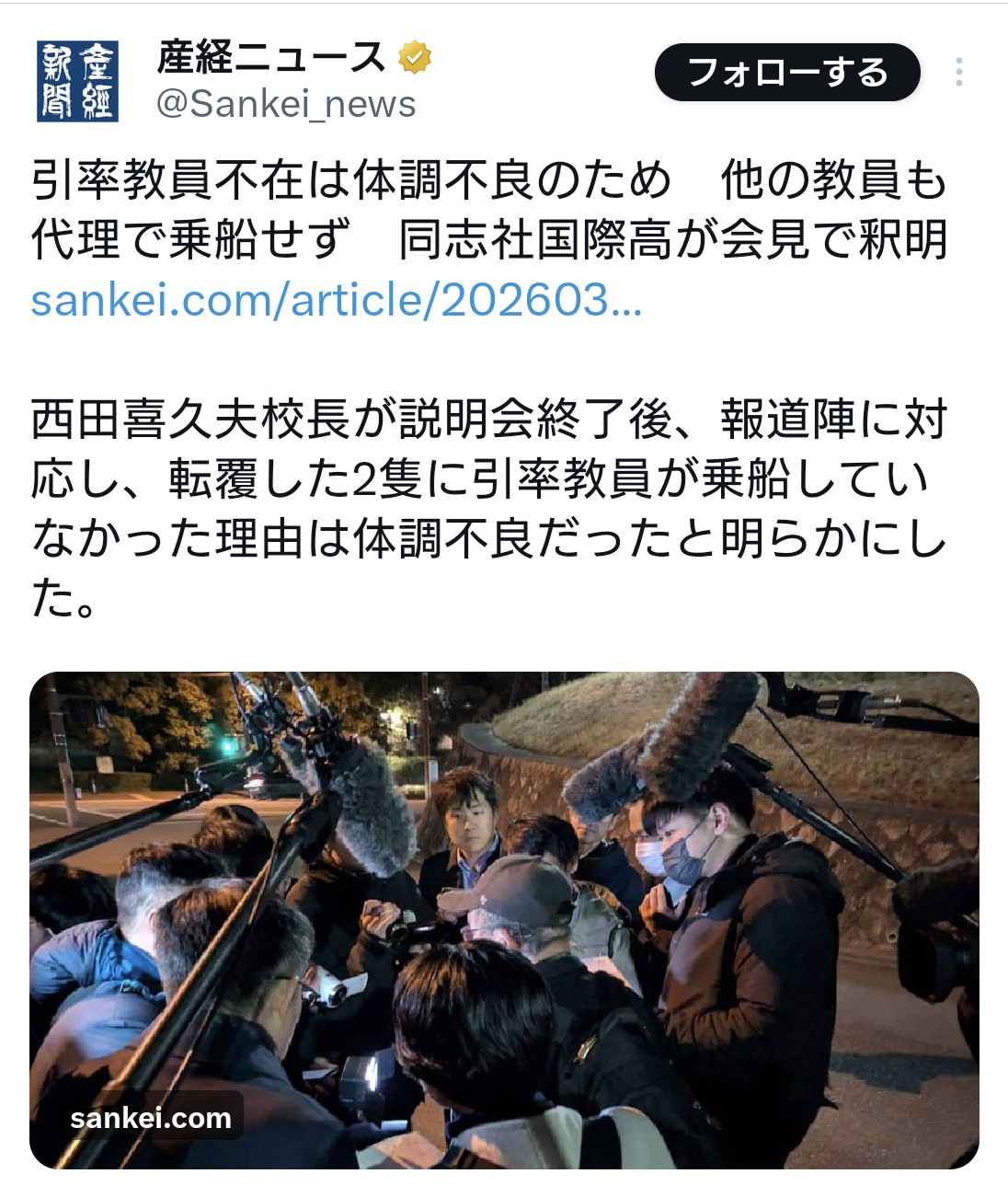 | … | 2無題Name名無し 26/03/24(火)20:10:06 IP:222.159.*(bbiq.jp)No.4396130+乗船の安全性に関して、西田校長は「いま把握している限りでは、2隻とも定員内で、立ち入り禁止区域には入っていない。全員が救命胴衣をつけていたと聞いている」とした上で天候や波の状態については、学校としては最終的に教員と話し合ったうえで「船長の判断にお任せした」と説明。「平和教育は本校の教育の中でも重要。今後も続けていくが、中身についてはもう一度精査してまいりたい」と述べた。 |