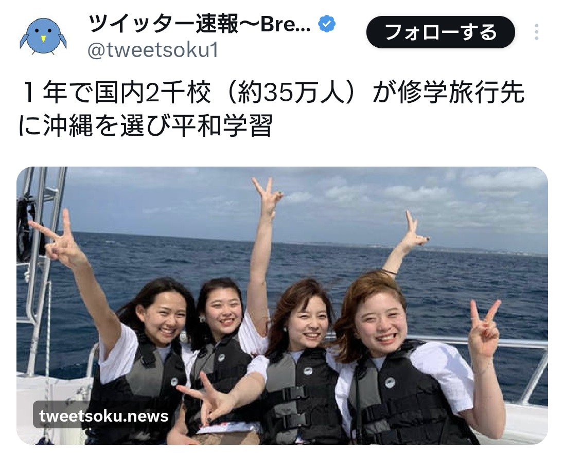 | … | 3無題Name名無し 26/03/24(火)20:10:31 IP:222.159.*(bbiq.jp)No.4396131+同高によると、計約270人の生徒が平和学習のため14〜17日の予定で沖縄を訪問。36人が前後半に分かれて乗船する予定で、前半組の18人が転覆事故に巻き込まれた。 |