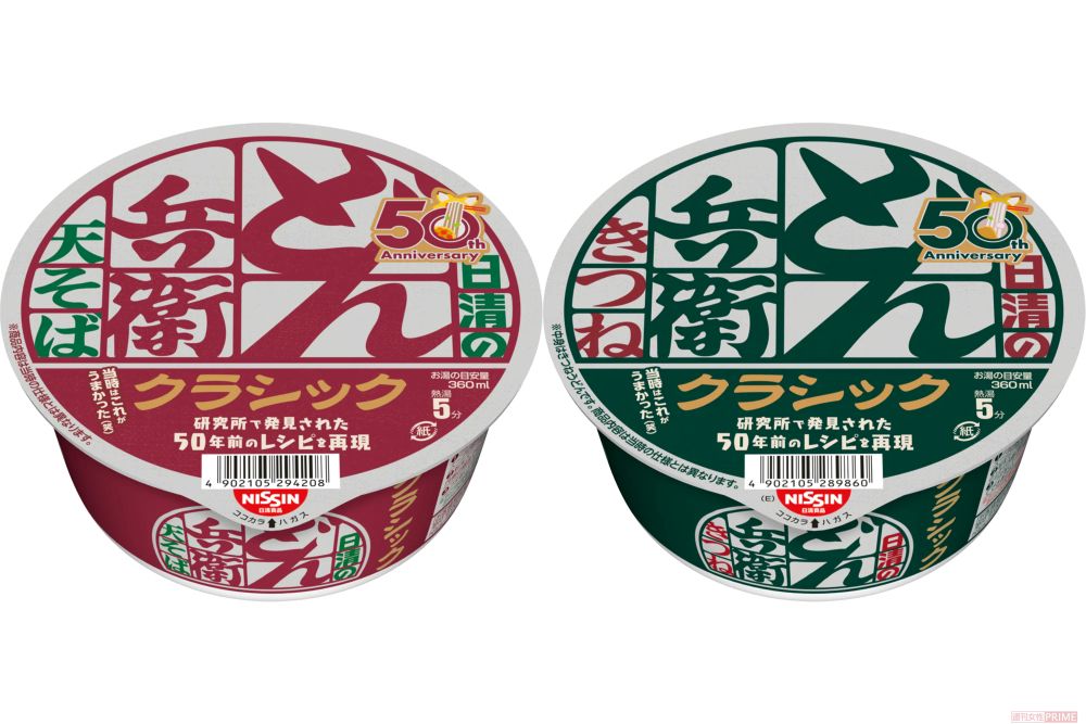 3月30日、日清食品が「日清のどん兵衛 天ぷらそば・きつねうどん クラシック」を発売した。発売から今年で50周年を迎える超ロングセラーの、記念商品第1弾。研究所に眠っていた当時のレシピをもとに、試作を重ねて発売当時の味わいを再現したという。