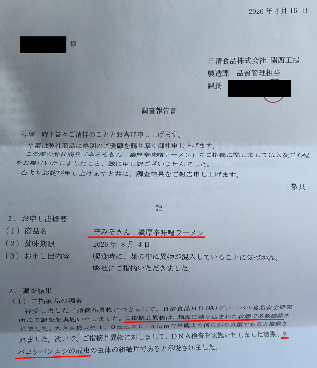 | … | 10無題Name名無し 26/04/25(土)12:41:22 IP:153.208.*(ocn.ne.jp)No.4399227そうだねx1 1777088482872.jpg-(761313 B) 辛みそきんの麺に虫の組織片が練り込まれてたそうですね |