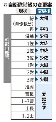 対象は「准尉」を除く尉官以上の幹部で、将補を「少将」、2佐を「中佐」、3佐を「少佐」、1尉を「大尉」などに変更する。数字の階級表記は、国民から1佐と2佐でどちらが高位なのか分かりにくいとの指摘が出ていた。