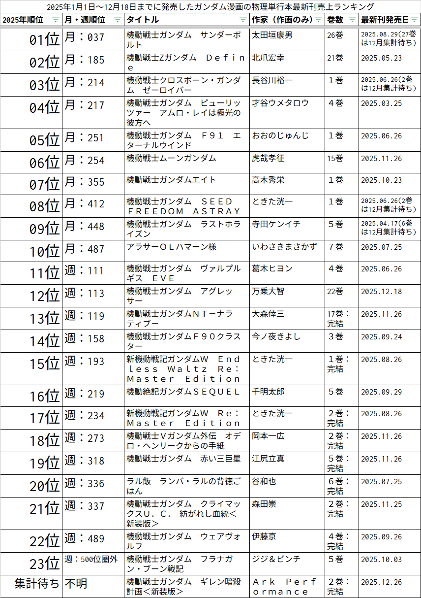 | … | 1無題Name名無し 25/12/28(日)18:41:47 IP:61.25.*(home.ne.jp)No.1804073そうだねx5ガンダム関係の漫画が1年にこれだけ出てることがまず凄いと思う |