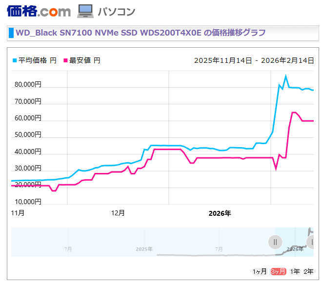 | … | 17無題Name名無し 26/02/05(木)13:50:15 IP:153.179.*(ocn.ne.jp)No.660198+メモリ品薄で今度は「SSD」が高騰中。まさかの約40万円まで値上がりする製品も |