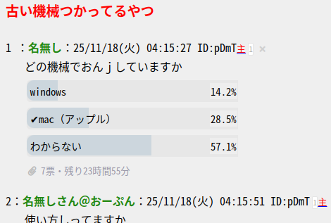 | … | 44無題Name名無し 25/11/18(火)21:06:20 IP:14.9.*(enabler.ne.jp)No.659029+同じパソコンに2chと5chが入ってる状態 |