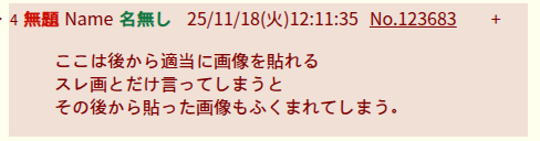 | … | 21無題Name名無し 25/11/18(火)13:31:23 IP:14.9.*(enabler.ne.jp)No.659003+なお掲示板は上からレスが連続していたり |