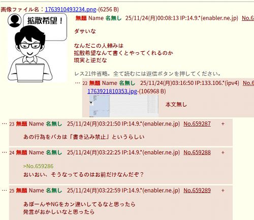 | … | 24無題Name名無し 25/11/24(月)06:55:51 IP:14.9.*(enabler.ne.jp)No.659320+「画像やレスを書き込む担当」が |
