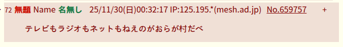 | … | 75無題Name名無し 25/11/30(日)00:50:01 IP:14.9.*(enabler.ne.jp)No.659760+ 1764431401869.png-(17214 B) 電話もない村は村とは言えない |