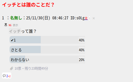 | … | 11無題Name名無し 25/11/29(土)10:40:44 IP:14.9.*(enabler.ne.jp)No.659692+押すフリしてみろ |