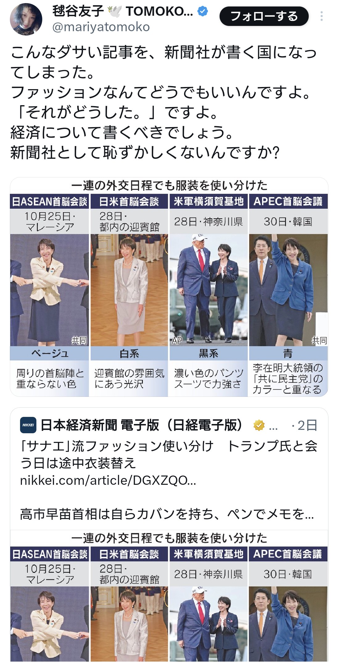 | … | 30無題Name名無し 25/11/08(土)14:37:32 IP:115.36.*(commufa.jp)No.4383468+よくわからんけどw、毬谷友子氏は高市首相の英語のスピーチをほめてる(ほめ殺し?w)わけかw |