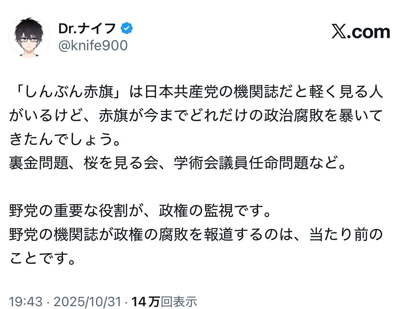 | … | 24無題Name名無し 25/11/05(水)11:56:18 IP:59.132.*(au-net.ne.jp)No.4383125そうだねx4 1762311378874.jpg-(168592 B) 党員が26万人程度しかいないのに80万部位は購読あるらしいですからね、世帯数全員買わされてるケースとか普通ありそうですね |