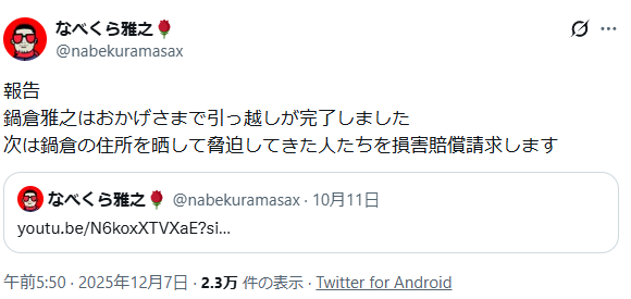 | … | 2無題Name名無し 25/12/17(水)11:12:18 IP:133.175.*(vectant.ne.jp)No.4387117+あの手の人たちかな? |
