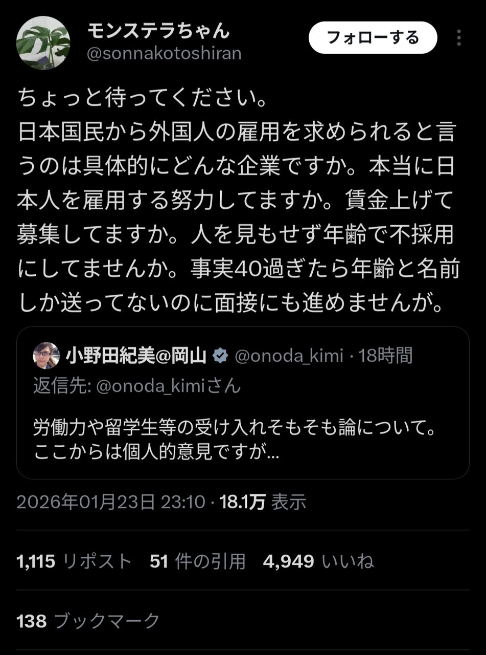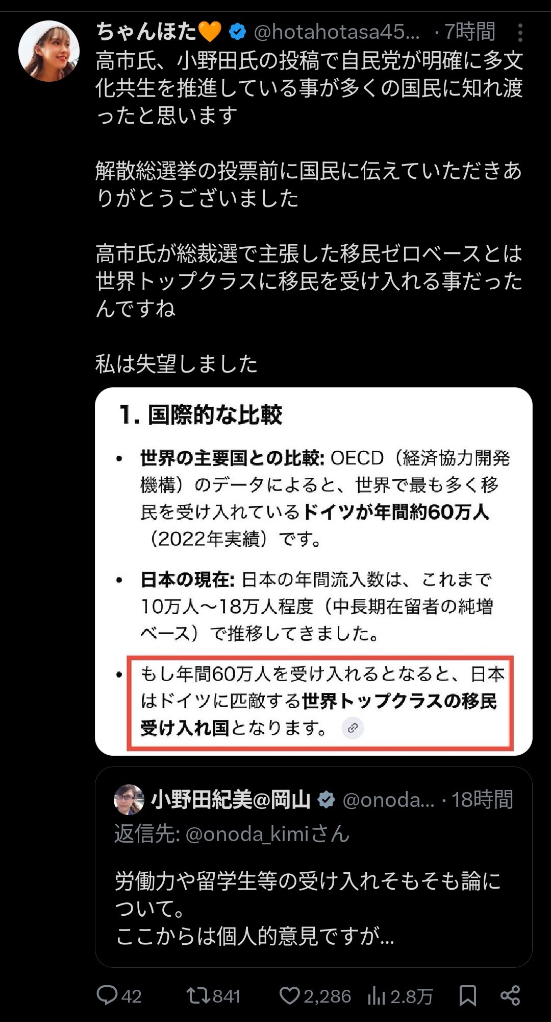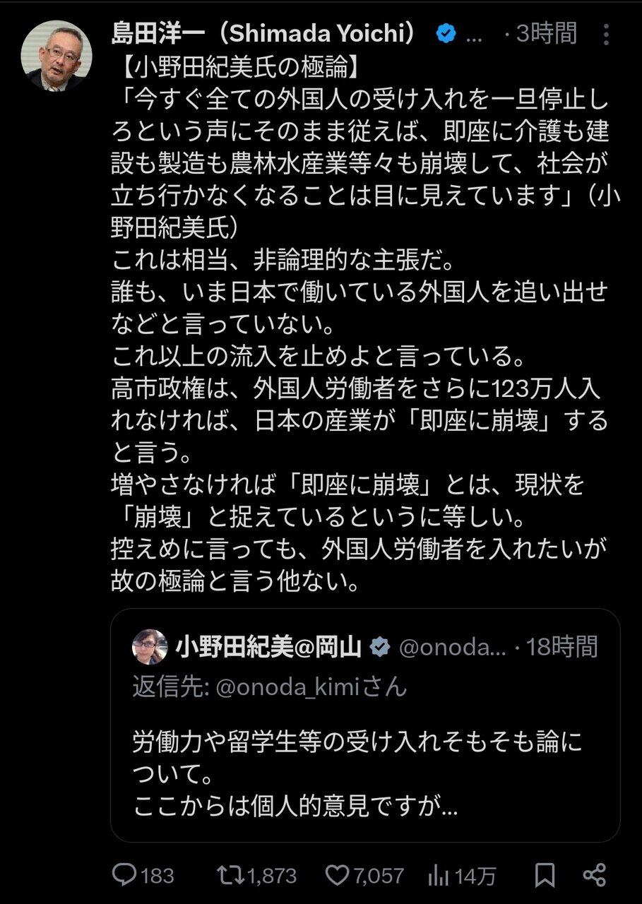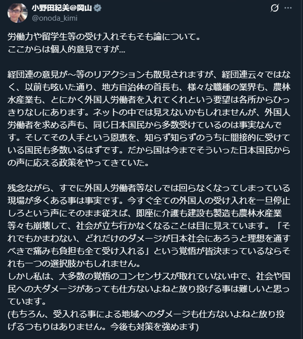 小野田氏は、自身が「外国人政策は日本の経済の礎にする」と発言したかのようにも受け取れるXユーザーの書き込みを引用し、「この写真は柔道整復師会の会ですが、こんな発言を私は一切していません」と言及。