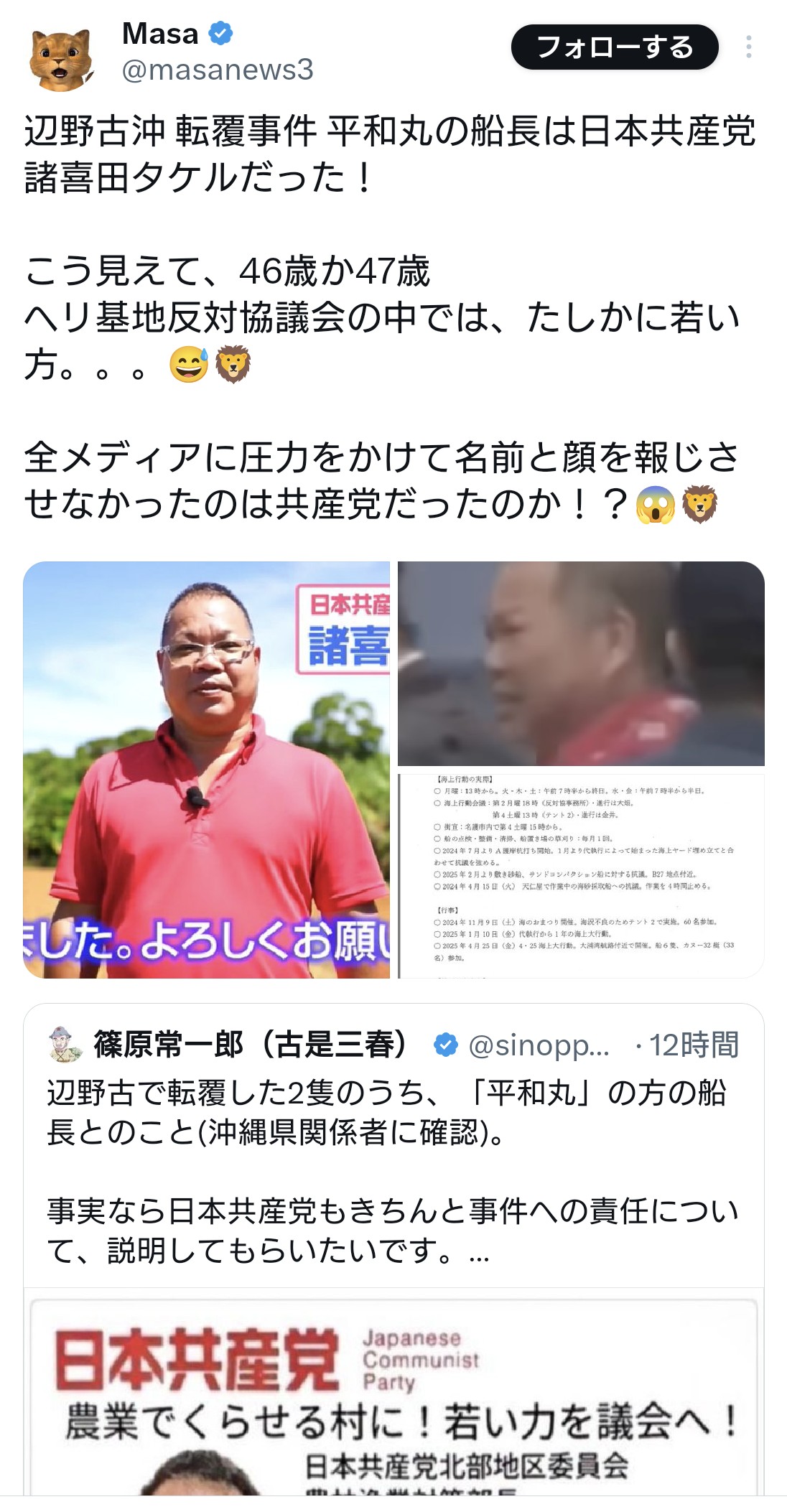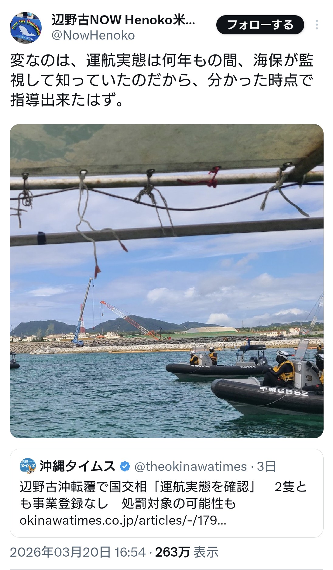 | … | 34無題Name名無し 26/03/22(日)23:59:24 IP:49.109.*(spmode.ne.jp)No.4395974+当局は抗議団体の杜撰な運航実態を知っていたのだから、抗議船の海上運送法の事業登録をあらかじめ取り消していればこんな事故は起きなかった……と |
