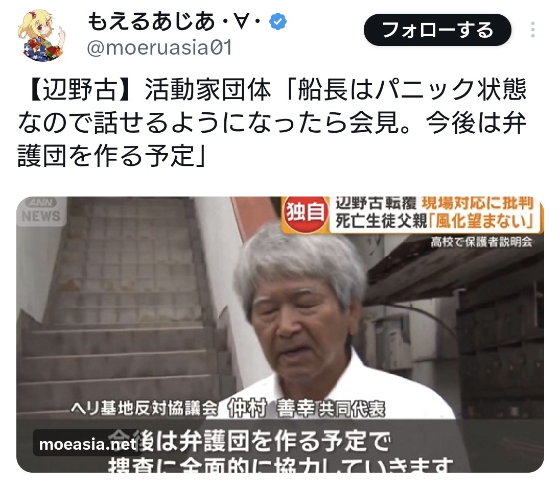 辺野古沖で船2隻が転覆した事故です。先日行われた学校の保護者説明会には亡くなった生徒の父親が出席し、「情報が出なくなって風化していくことを望んでいない」と心境を明かしました。レス10件省略。全て読むには返信ボタンを押してください。