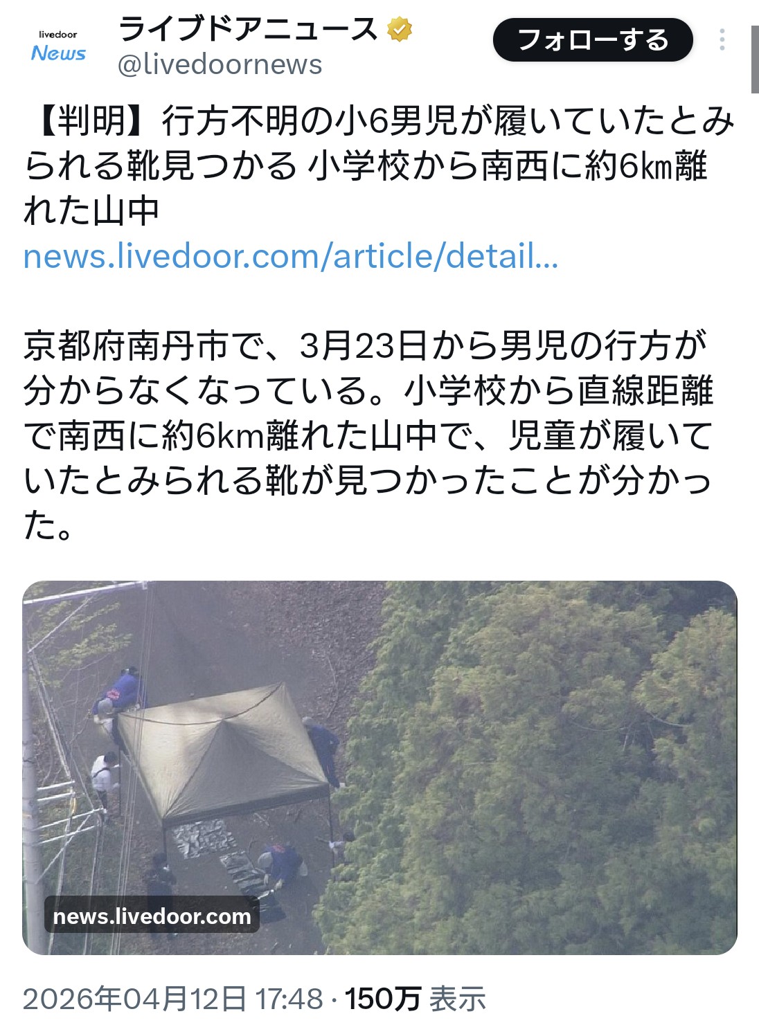 京都府南丹市で3月から行方が分からなくなっている市立園部小の安達結希(ゆき)さん(11)について、府警は7日朝、安達さんの自宅周辺の捜索を始めた。レス21件省略。全て読むには返信ボタンを押してください。