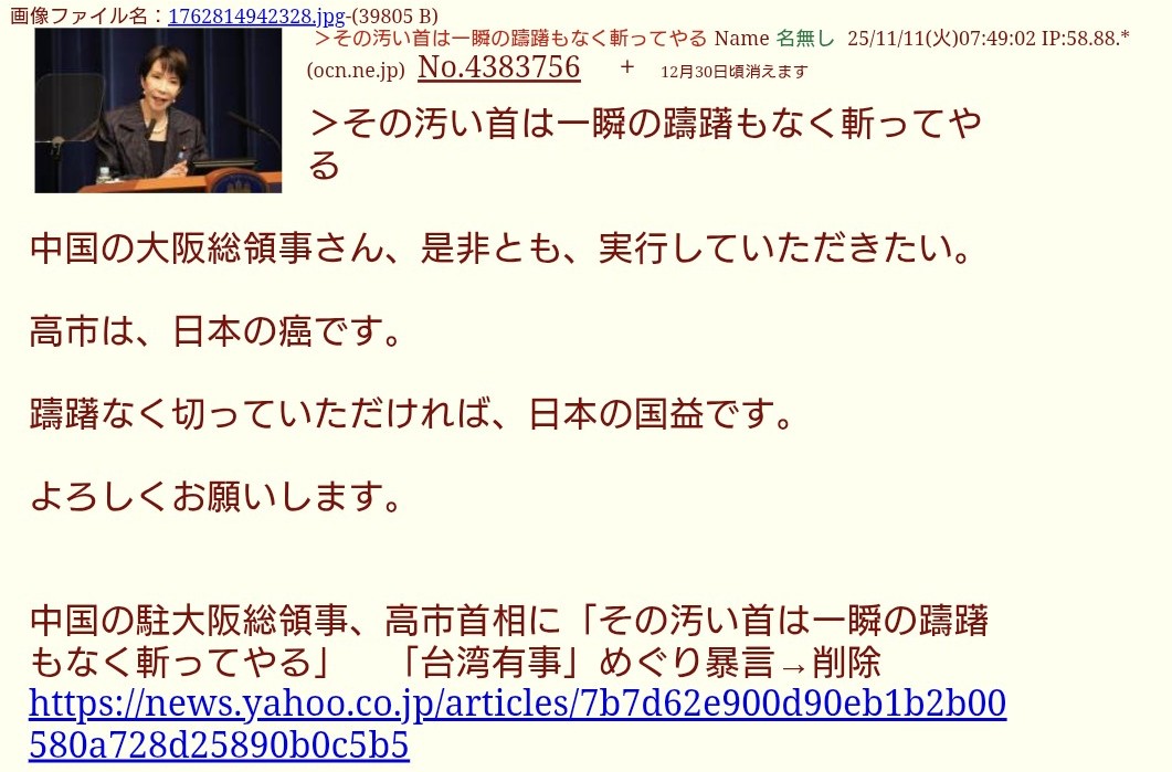 | … | 6無題Name名無し 25/11/19(水)22:10:22 IP:123.216.*(ocn.ne.jp)No.4384741+書き込みをした人によって削除されました |