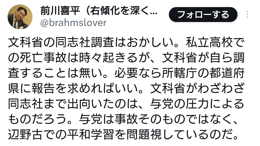 | … | 32無題Name名無し 26/04/28(火)07:30:33 IP:180.147.*(eonet.ne.jp)No.4399428+>貧困調査おじさんが何かほざいてるな、私立高校で死亡事故ってそんな頻度であるの? |