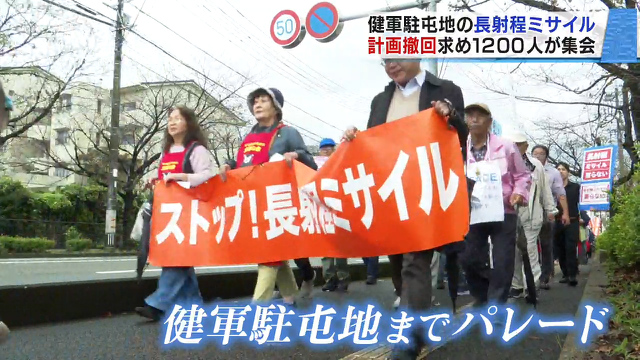 この後、参加者は「ストップ!長射程ミサイル」と書かれた横断幕などを持ち、健軍駐屯地までパレード。