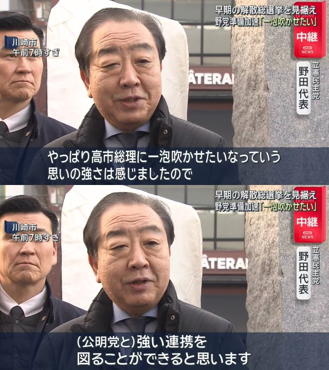 高市首相の解散意向を受け、各党の動きが慌ただしくなってきた。立憲民主党の野田佳彦代表は13日時点で、公明党との連携を視野に入れた上で「やっぱり高市総理にひと泡吹かせたい」などと発言していた。