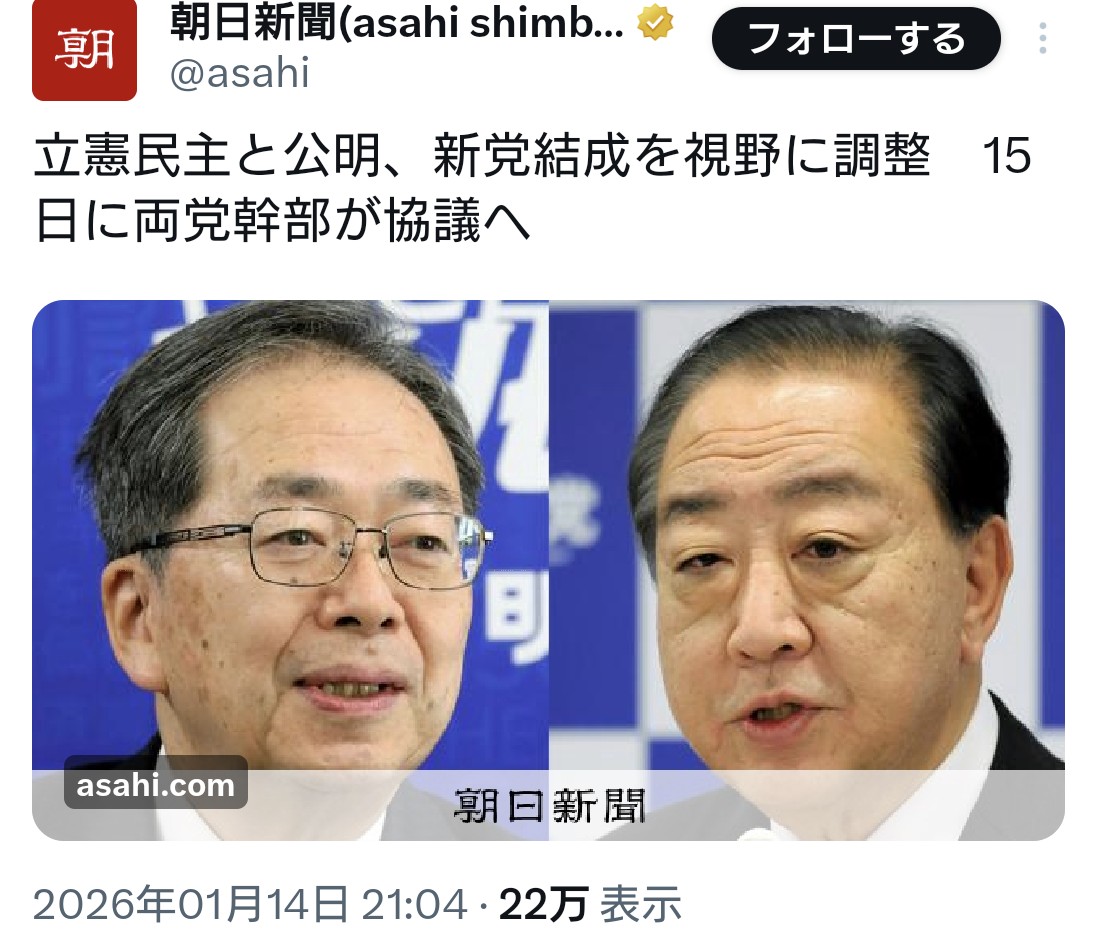 | … | 36無題Name名無し 26/01/14(水)23:42:27 IP:153.190.*(ocn.ne.jp)No.4389235そうだねx1>え?立憲と公明で新党? |