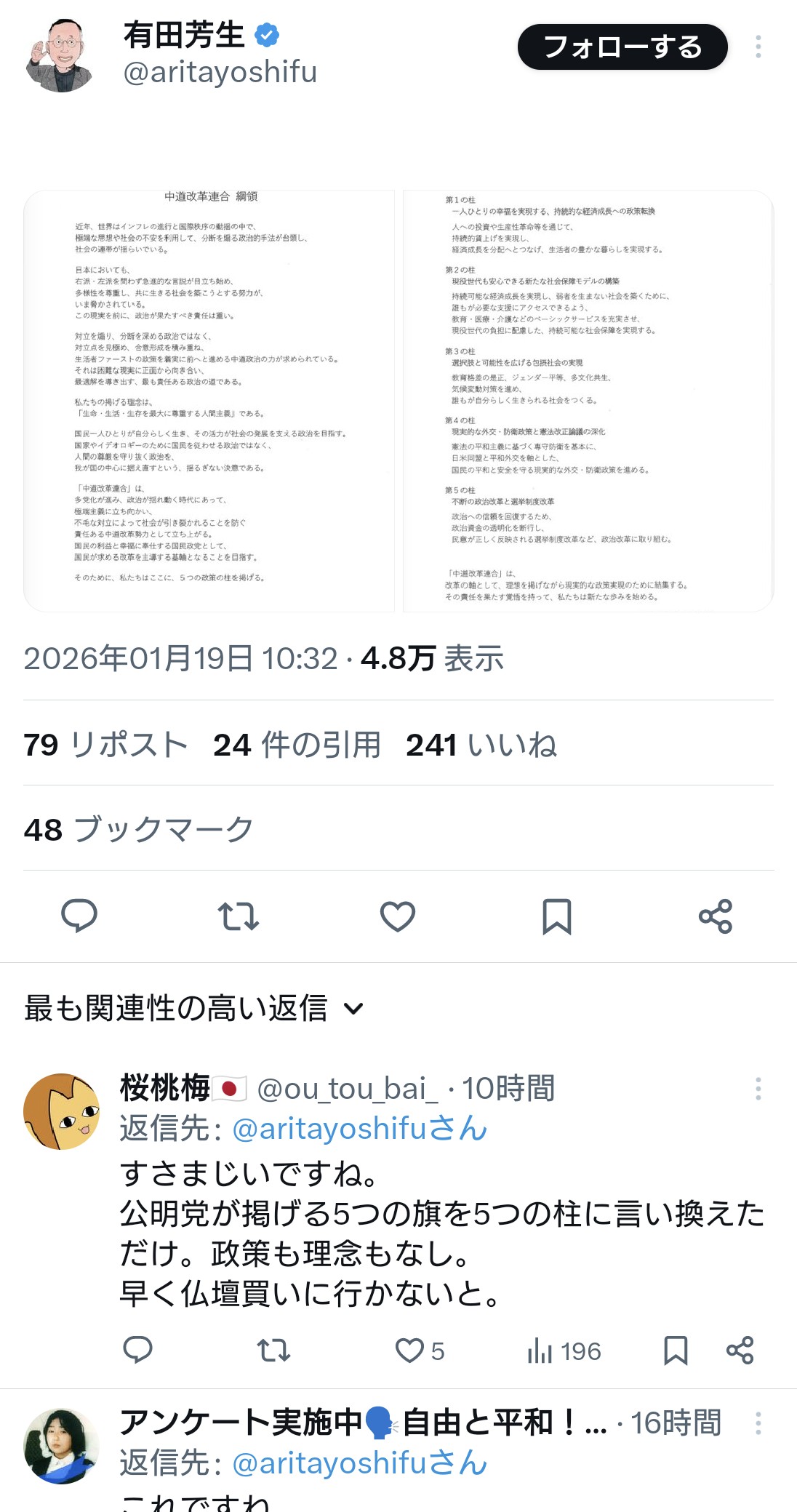| … | 30無題Name名無し 26/01/20(火)08:45:58 IP:106.155.*(au-net.ne.jp)No.4389740そうだねx1 1768866358568.jpg-(369730 B) 公明党さんは例の党HPの立憲批判のページをまだ消してないんですね…テレビでも取り上げられてましたよね? |