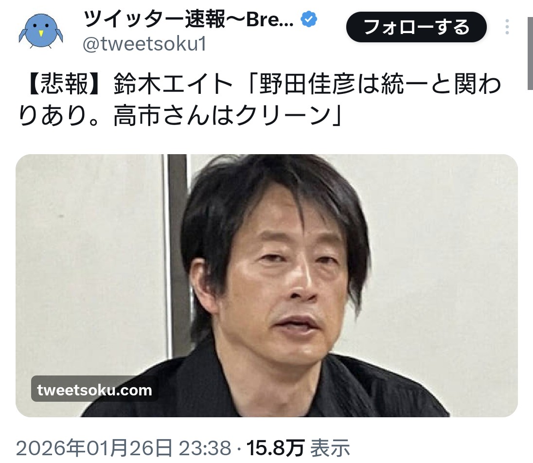 | … | 34【ゆけゆけ佳彦】「旧統一教会系が野田佳彦氏支援」Name名無し 26/01/28(水)07:59:43 IP:153.246.*(ocn.ne.jp)No.4390462+ 1769554783084.png-(244864 B) …関係者証言「教団施設で『巨人の星』替え歌で激励」 |