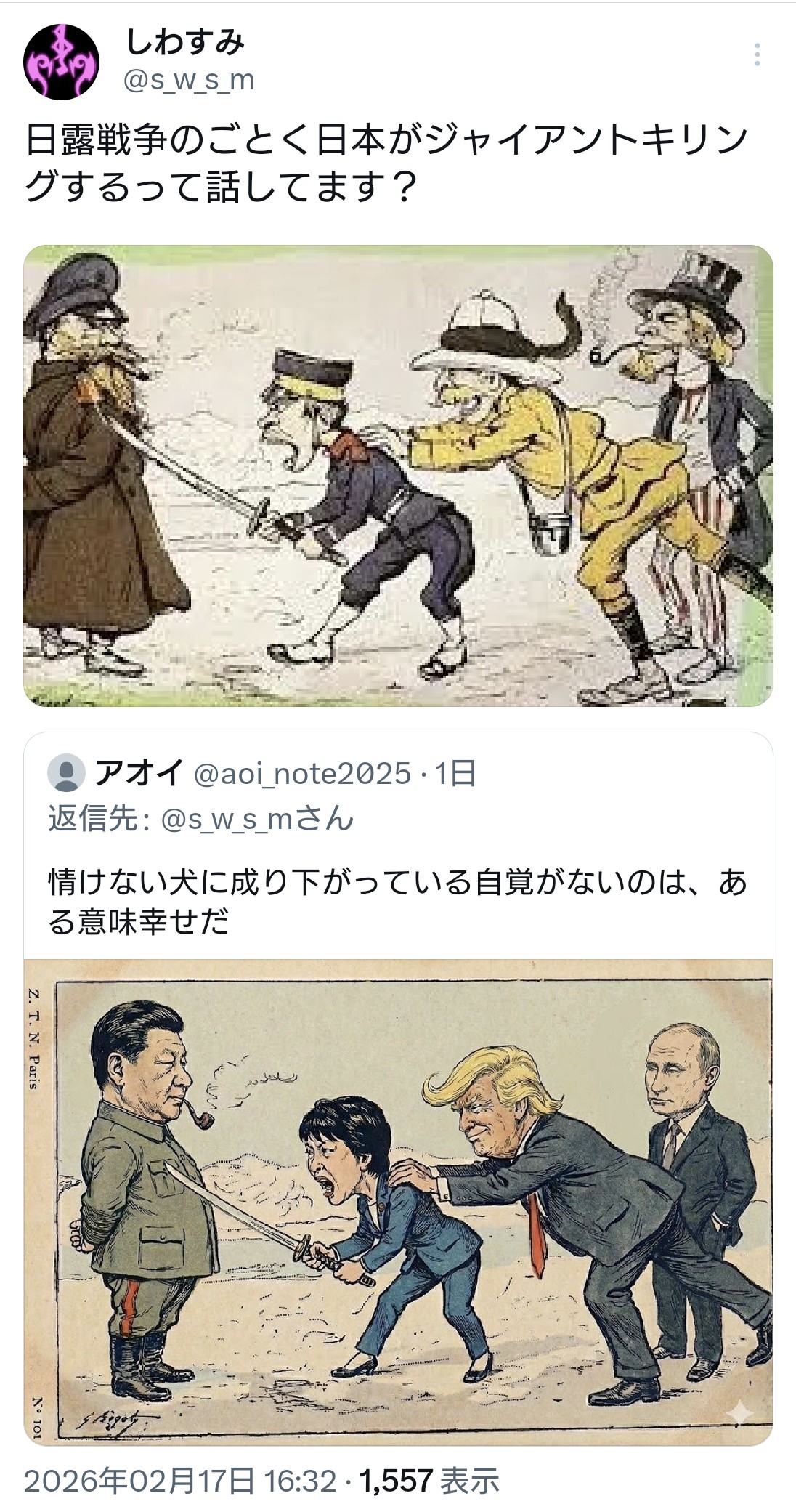| … | 14無題Name名無し 26/02/17(火)18:47:33 IP:106.129.*(au-net.ne.jp)No.4392662そうだねx1 1771321653911.jpg-(590887 B) 「日本はアメリカの代わりに中国と戦争させられるんだぞ!」 |