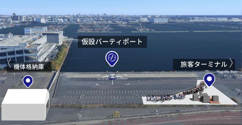 この日はパイロットを含め3人乗りの機体による無人のデモ飛行を報道公開し、約3分半飛行した。旅客ターミナルにはトレーラーハウスを採用し、面積は約54平方メートル。乗客役の関係者が顔認証システムでチェックインし、保安検査を受けた。