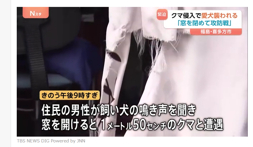 … | 17飼い犬の鳴き声を聞き窓を開けるとクマ「手が入ってきて…」 飼い犬は襲われ死ぬ 福島・喜多方市Name名無し 25/09/18(木)17:05:33 IP:153.246.*(ocn.ne.jp)No.4378828+ 1758182733923.png-(397289 B) ![]() きのうの夜、福島県喜多方市の住宅にクマが侵入し、飼い犬が襲われる被害がありました。 |