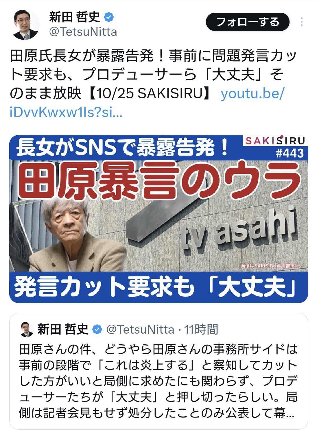 さらに、田原氏の不適切発言を編集でカットすることを怠ったとして、番組責任者と編成制作局長を譴責(けんせき)の懲戒処分とした。