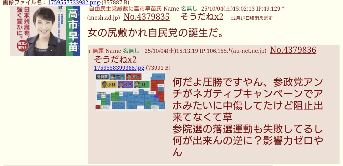 | … | 21無題Name名無し 25/11/03(月)14:04:45 IP:210.171.*(bai.ne.jp)No.4382992+高市は統一教会が望んでいる通りに動いているよな。マジで。 |