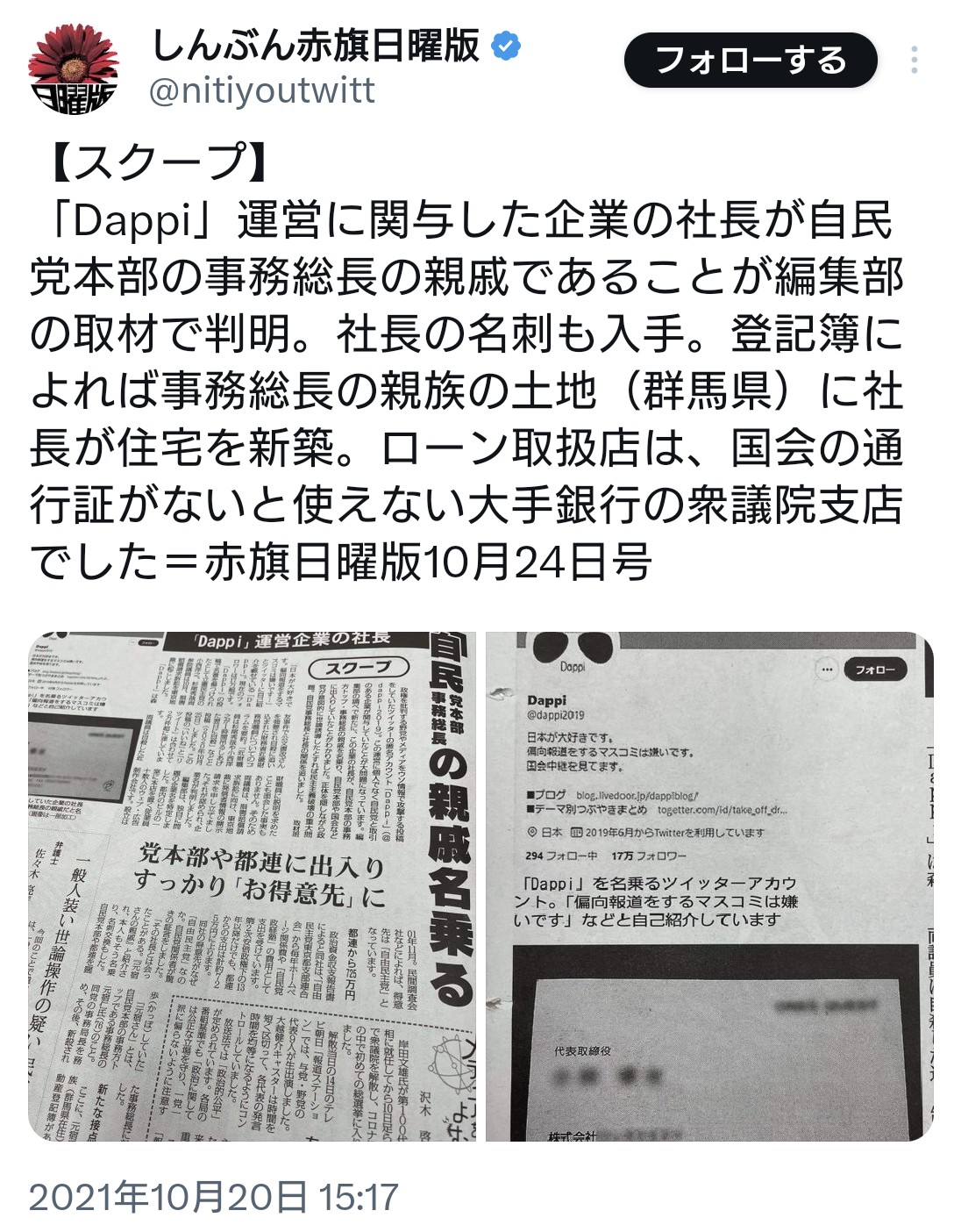 申し入れは、赤旗の小木曽陽司編集局長(党常任幹部会委員)と山本豊彦日曜版編集長の連名で行われ、藤田氏が10月30日にXに取材記者の名刺の画像を公開したことを@政権与党幹部によるジャーナリズムの取材活動への重大な妨害、威嚇行為A個人情報の無断公開によるプライバシー侵害―とした上で、画像の削除と謝罪などを求めている。