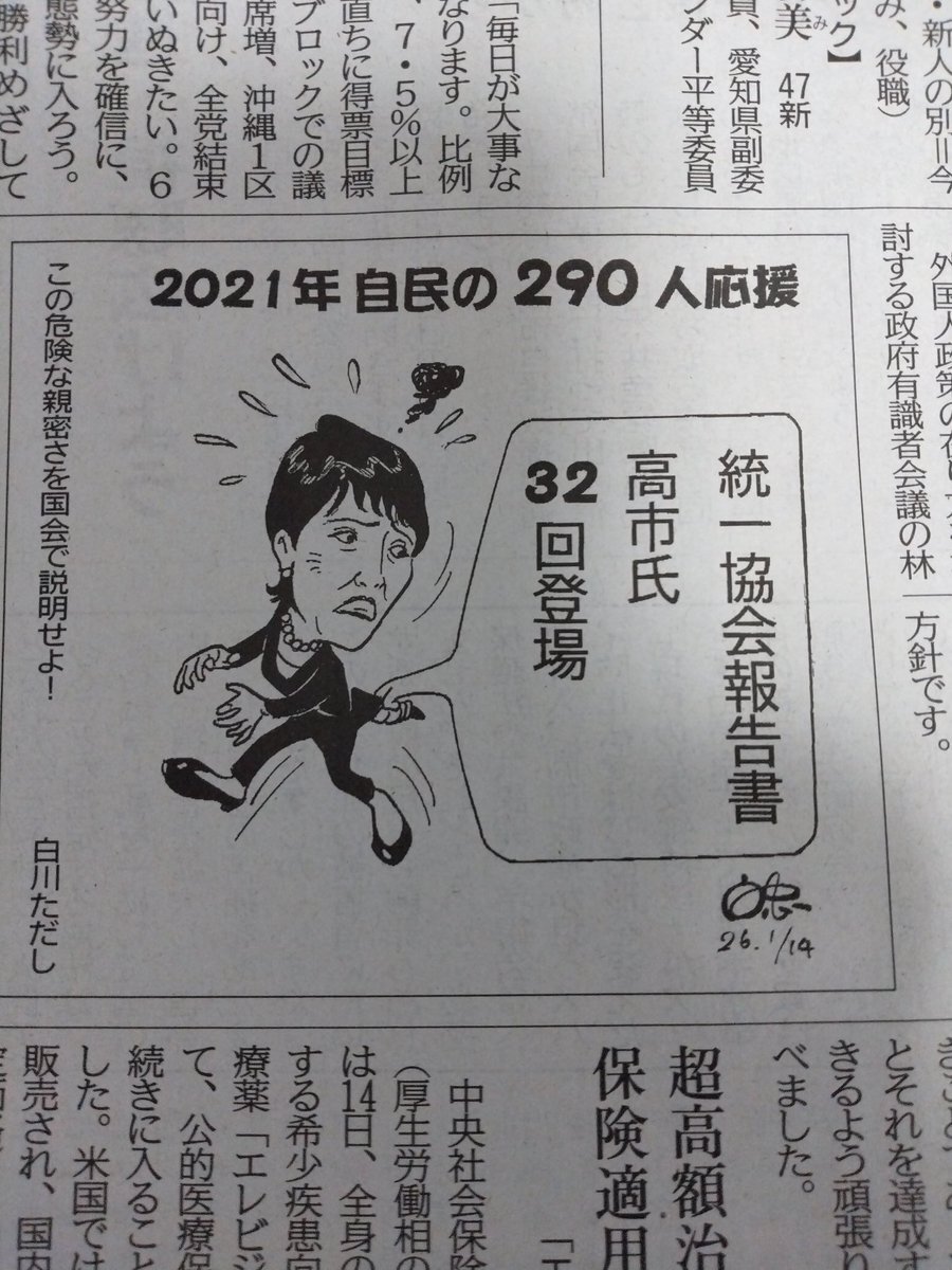 | … | 3無題Name名無し 26/01/16(金)14:02:48 IP:153.195.*(ocn.ne.jp)No.4389399そうだねx1記事を読むと高市氏の側近とされる人物が自分が候補の選挙戦に関して、本人は安倍の応援演説に同行して、統一教会の応援集会に夫人を代わりに出席させたってもの。 |