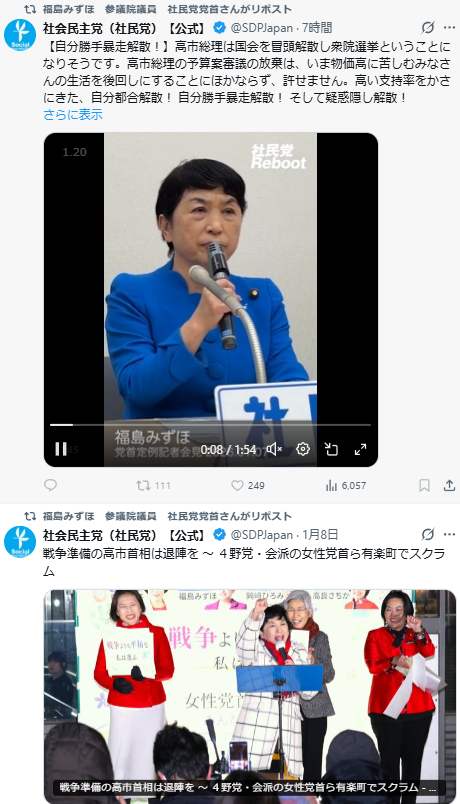 | … | 7無題Name名無し 26/01/16(金)17:10:13 IP:106.155.*(au-net.ne.jp)No.4389427そうだねx2 1768551013208.png-(348220 B) 社民党は論外だな、退陣要求した翌週にこんな事言ってんじゃ痴呆症を疑われても文句言えない |