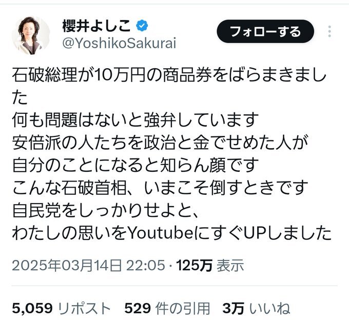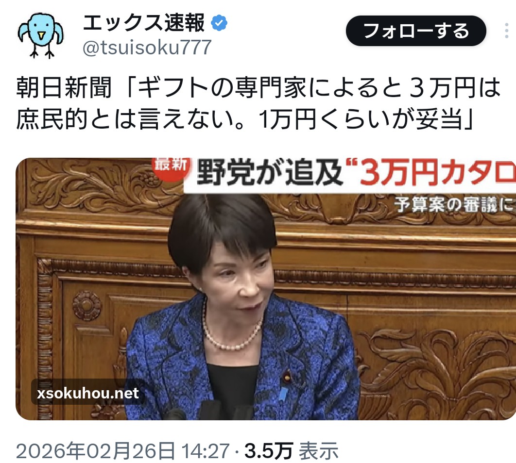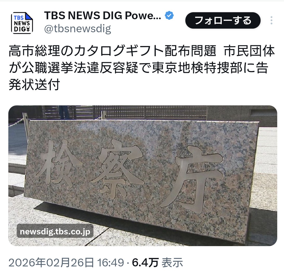 高市総理が3万円分のカタログギフトを315人に渡していたことを認めました。法的には問題ないと説明していますが、自民党内でも意見が分かれる事態になっています。レス6件省略。全て読むには返信ボタンを押してください。