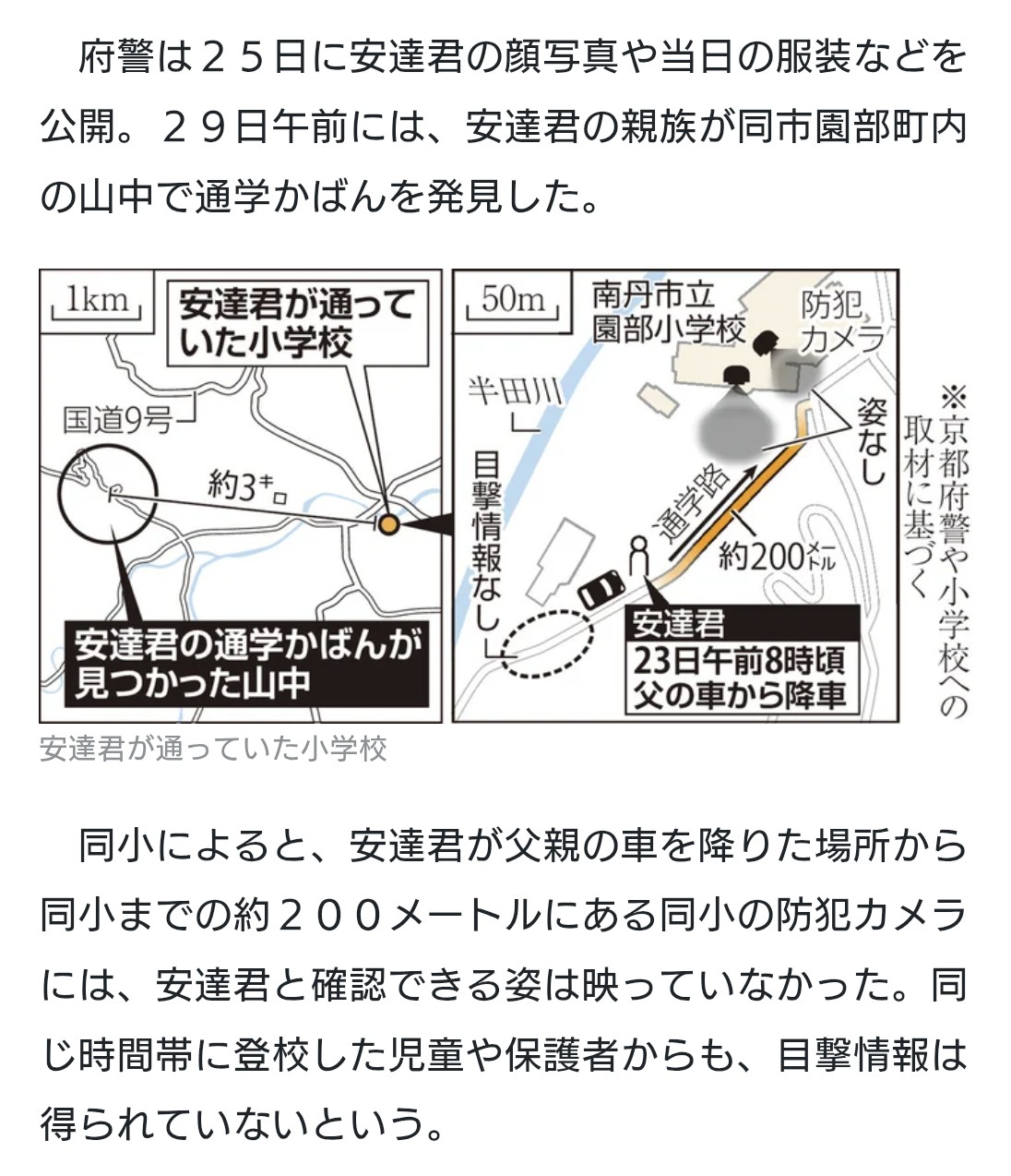 行方不明になった男子児童の通学用かばんは、発見前の3回の捜索では見つかっていなかった。レス3件省略。全て読むには返信ボタンを押してください。