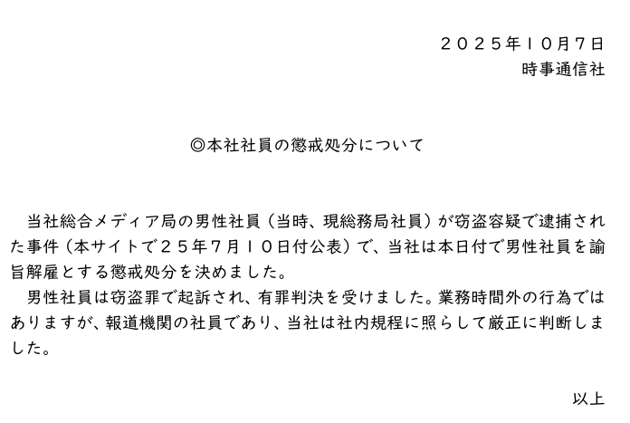 時事通信は同社のニュースサイトに、事実関係を記した記事を掲載。「支持率下げてやる」「支持率下げる写真しか出さねーぞ」との発言を同社映像センター写真部所属の男性カメラマンの発言だと確認したと認め、「本人を厳重注意したことを発表した」とも報じた。
