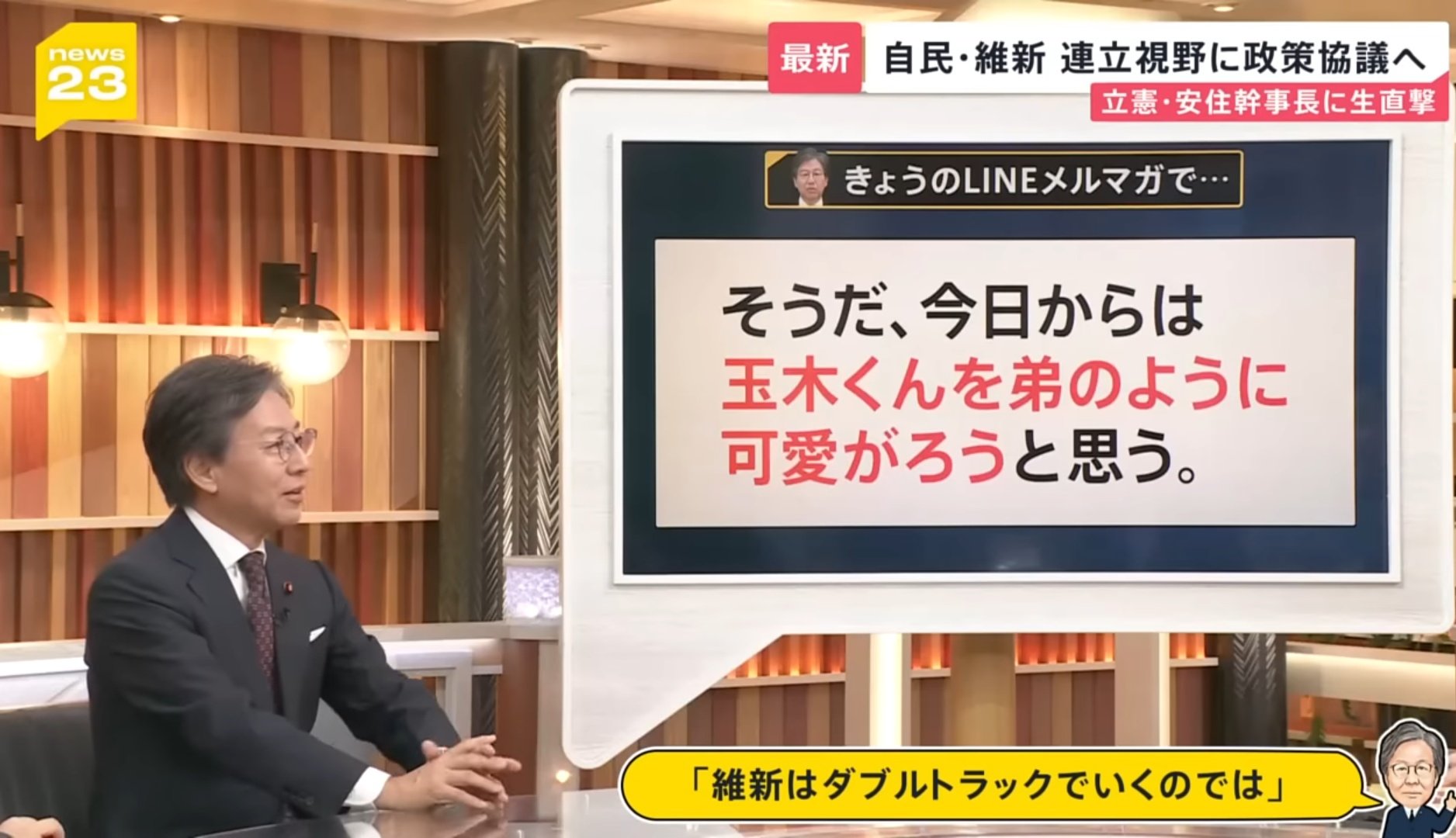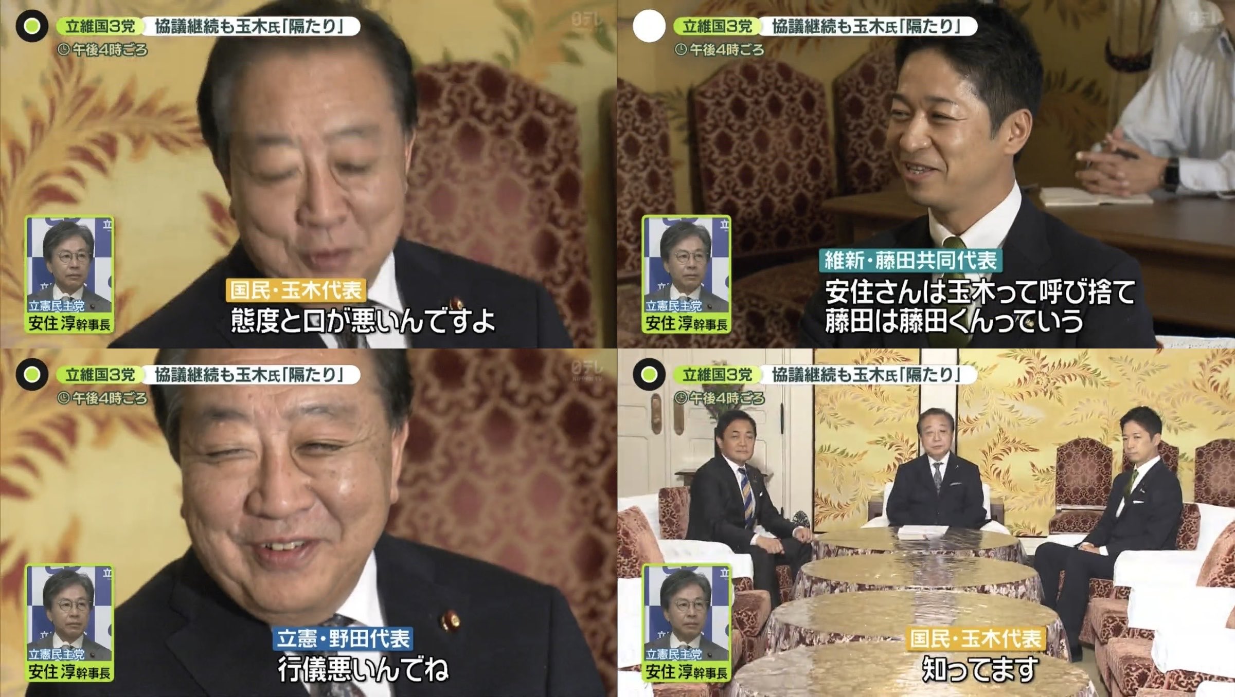 立川は「立民の安住さんが連立の決断出来ない国民の玉木さんに対して『理念も大事だが綺麗事で誤魔化しているうちは本物ではない。場合によっては野田代表をおろしてもいい』と言ったそうな。めちゃくちゃだ。そんな党に日本を任せられるわけがない」と苦言を呈した。