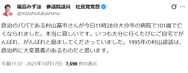 … | 9無題Name名無し 25/10/18(土)09:09:00 IP:153.190.*(ocn.ne.jp)No.4381501そうだねx1社会党(社民党)だったけど、この人は何か憎めないないキャラだったのだよなww |