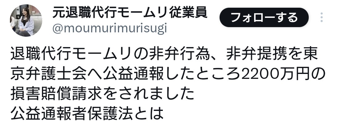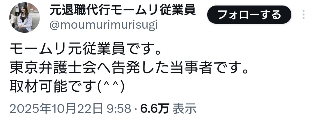| … | 4無題Name名無し 25/10/22(水)12:19:20 IP:180.11.*(ocn.ne.jp)No.4381878+退職代行「モームリ」を警視庁が捜索、報酬目的で顧客を弁護士に紹介した非弁行為容疑 |