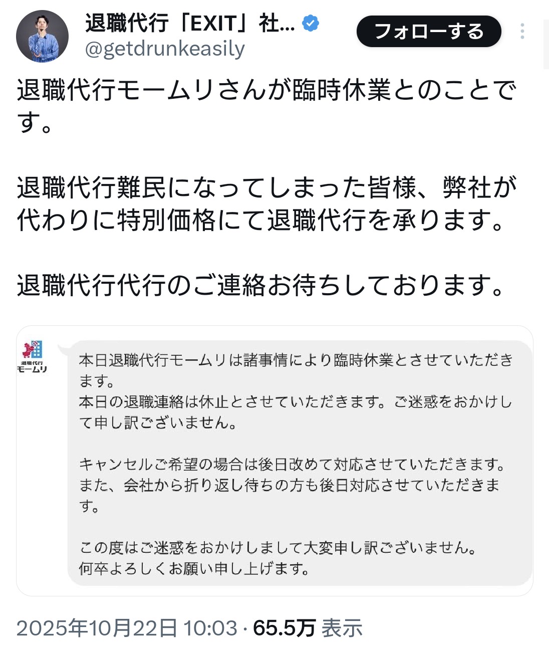 | … | 9無題Name名無し 25/10/22(水)17:16:24 IP:153.246.*(ocn.ne.jp)No.4381902そうだねx1「退職代行モームリ」の社員さん、他の退職代行を使って退職か? w |