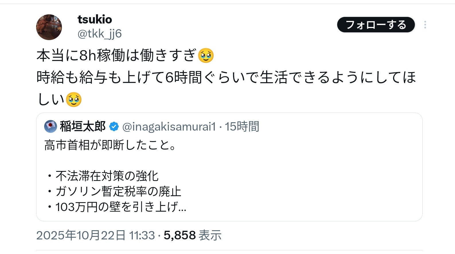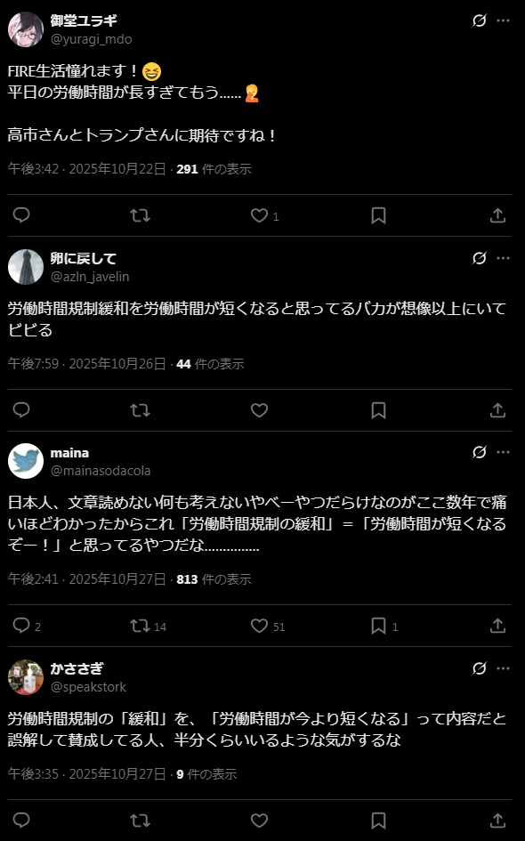 | … | 25無題Name名無し 25/10/30(木)20:48:11 IP:180.50.*(ocn.ne.jp)No.4382629+>高市さんの支持層には『労働時間規制緩和=労働時間が短くなる』と思ってる人がいるのか?  |