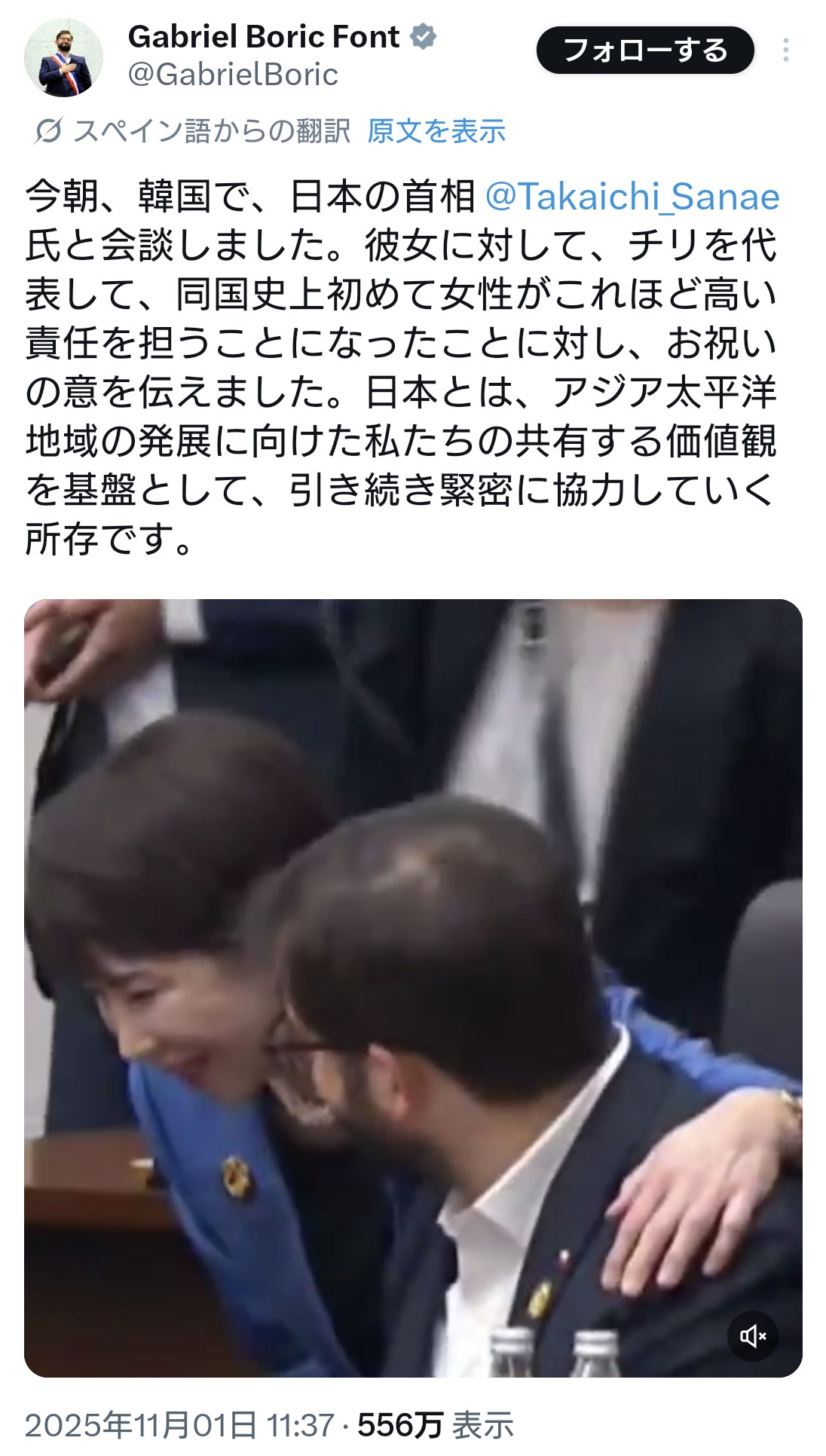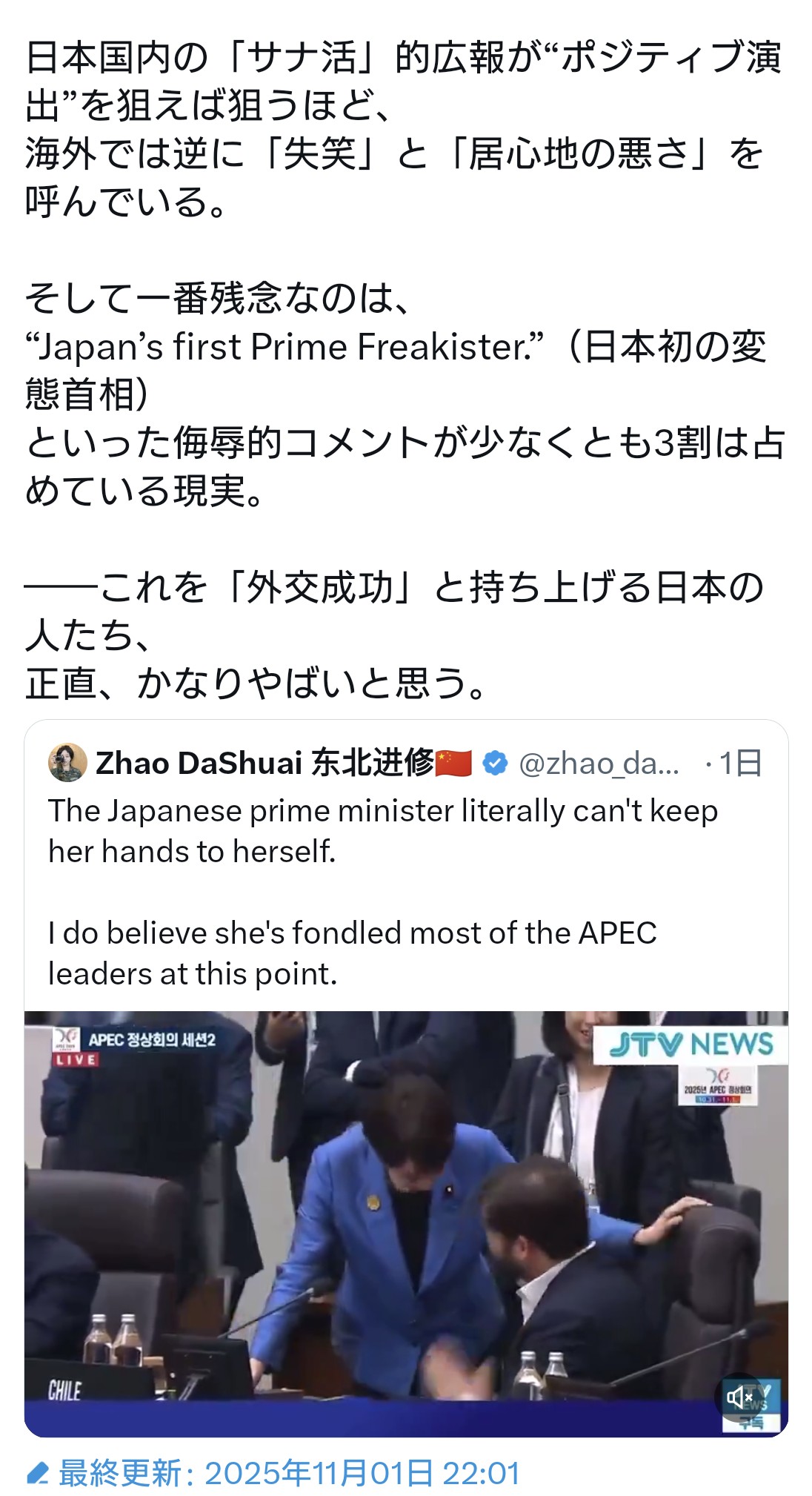 さらに、「日本が対米屈従権力であることに加え、女性差別を『もろともせず』のし上がった人物の悲しい姿。彼女個人の自己顕示欲の強さも痛々しい」(原文ママ)と皮肉を交え、高市首相を批判した。