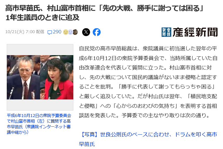 高市早苗首相は7日の衆院予算委員会で、過去の植民地支配と侵略を認めて謝罪した「村山談話」を含む歴代内閣の歴史認識について、「これまでの内閣総理大臣談話を含めて、歴史認識に関する歴代内閣の立場を全体として引き継いでおり、これからも引き継いでいく」と述べた。削除された記事が1件あります.見る