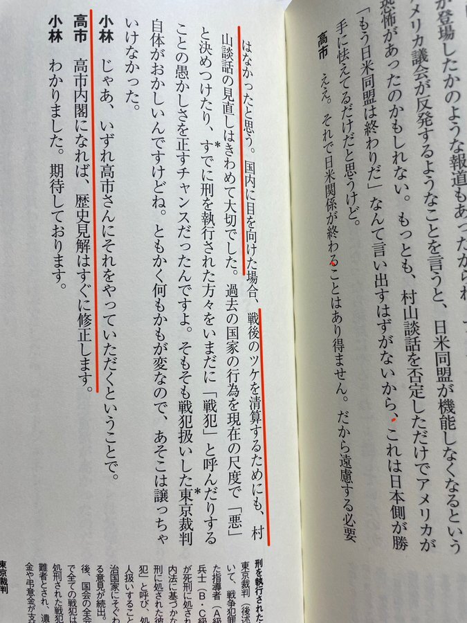 | … | 4無題Name名無し 25/11/08(土)19:46:42 IP:59.132.*(au-net.ne.jp)No.4383504+村山氏「私は、今日本の国の首相として、日本の国を代表してアジアの国々に行けば、そういうふうに被害を与えた方々に対しては、大変申しわけなかったと、やはりその反省の気持ちを表すのは当然ではないかと思う。それはやはり日本国民全体が反省する問題として私は受けとめて、過ちは繰り返さないようにするというぐらいの決意はしっかり持って、平和を志向していく方向に努力していきたいというような意思も合わせて表明することは、当然ではないかというふうに思っている」 |